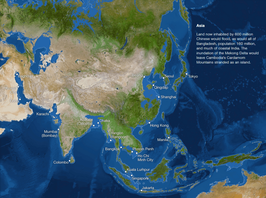 Laut jüngsten Studien wird der Meeresspiegel um mindestens 3 Meter steigen und dagegen kann auch keine globale Klimaneutralität mehr helfen. Wenn der Meeresspiegel um 66 Meter steigen würde, dann werden mehrere Länder Katastrophen erleben, wie unten auf den Karten von National Geographic zu sehen ist.